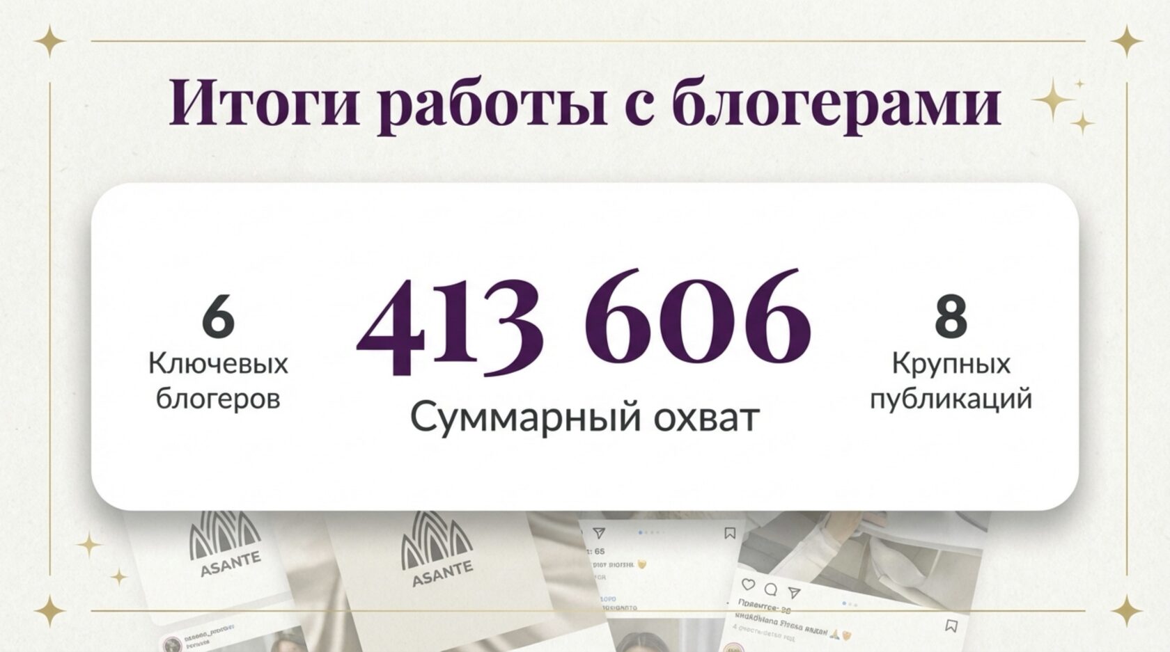 Результат: 413 606 уникальных пользователей через stories, reels и посты в Instagram, VK, Pinterest.